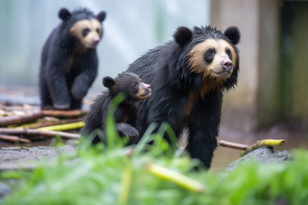 A Malayan sun bear delicately licks its paw amidst a glowing forest environment, surrounded by lush foliage and soft light filtering through the trees.