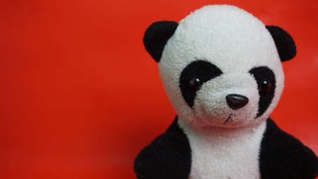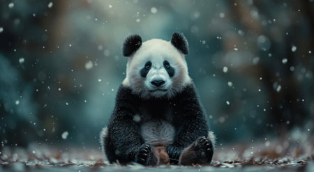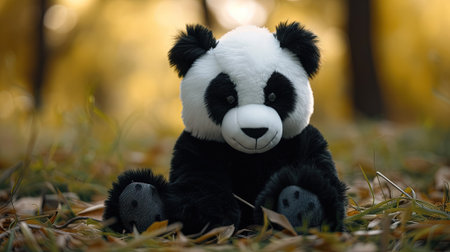 Cute panda bear sitting in the autumn forest. Selective focus.