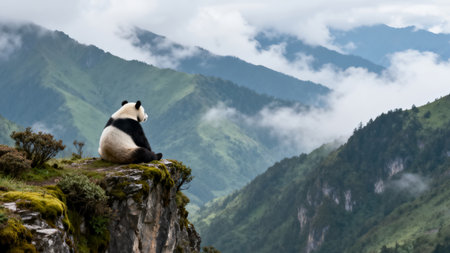 Giant Panda Sitting on Cliff Edge Overlooking Misty Mountains