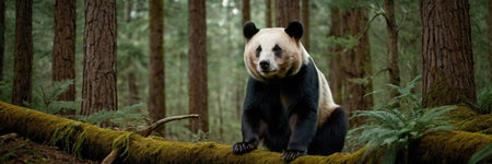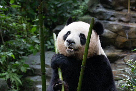 This captivating image features a giant panda intently munching on bamboo, surrounded by lush greenery, highlighting the beauty of wildlife in its natural habitat.