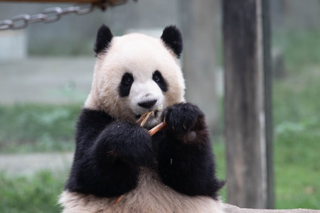 Portrait of giant panda eating bamboo, side view. Cute animals of China. Cute panda bear close up.