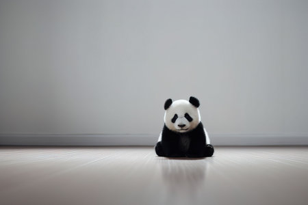 a black and white stuffed panda sitting next to a shiny bokeh background.