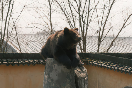 A brown bear stands alert, gazing into the distance, its thick fur catching the light