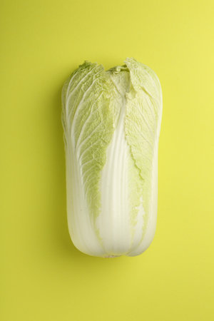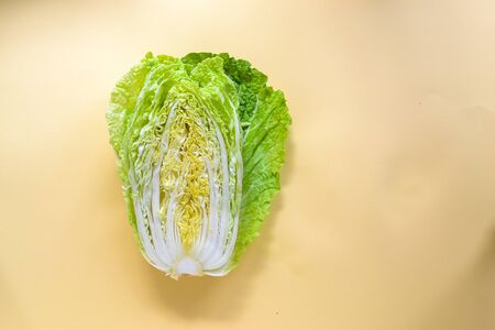 The food is minimal in style. Creative healthy food concept. Chinese cabbage on a yellow pastel background. Vegetarian food, vegetables. Top view, flat lay, free place for text.