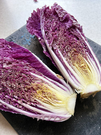 purple Chinese cabbage, vegetable, purple vegetable on a wooden board, washed Chinese cabbage