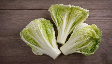 Three vibrant romaine lettuce heads sit together, showing their fresh green leaves and crisp texture. Ideal for salads or cooking, these vegetables add flavor and nutrition..