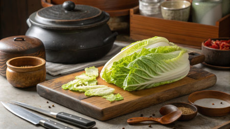 Lively green cabbage leaves being sliced and prepared for an authentic kimchi fermentation process..