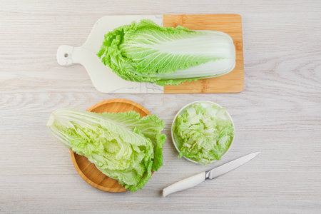 Chopped Chinese Cabbage, Napa Cabbage or Wombok on Wood Cutting Board Background. Fresh Green Sliced Cabbage Salat on Wooden Chopping Board