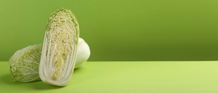 Fresh ripe Chinese cabbages on green background, space for text. Banner design