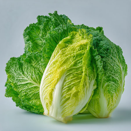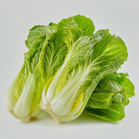 Two vibrant romaine lettuce heads display their crisp leaves, ready for use in salads. The fresh greens shine against a simple background, highlighting their rich texture and color.