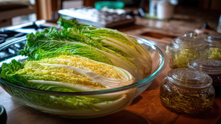 This captivating image showcases fresh green and yellow napa cabbage beautifully arranged in a glass bowl on a rustic kitchen countertop, emphasizing vibrant colors and natural textures. Perfect for culinary enthusiasts!
