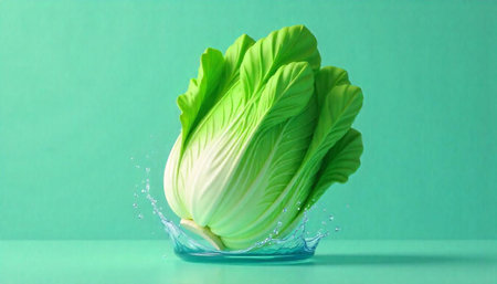 Fresh Bok Choy with water splash on a green backdrop