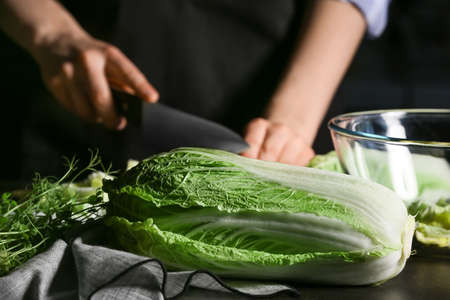 Woman cutting fresh chinese cabbage on table, closeup