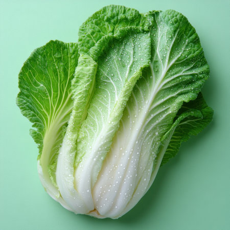 Fresh napa cabbage with water droplets on a pastel green surface.