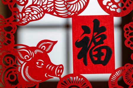 Chinese New Year symbols on red paper background, close-up.