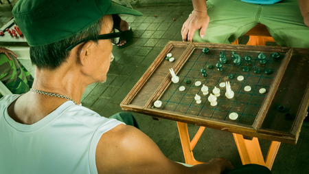 Unidentified old man is racing chess at Bangplat Bangkok , Thailand. The chess is favorite activity of thai old people in here.