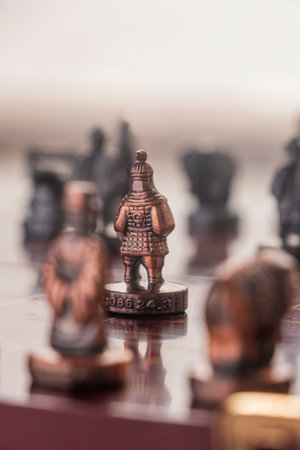A powerful close-up of the antique copper Chinese Chess Xiangqi General, symbolizing leadership, strategy, and power. Perfect for concepts like business planning, conflict resolution, or cultural games.
