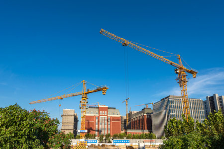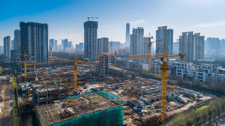 Vibrant construction site with towering cranes and high rise buildings under bright blue sky