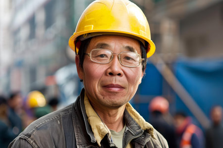 A smiling senior Chinese male construction worker standing in construction site. Generative AI AIG19.