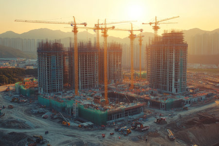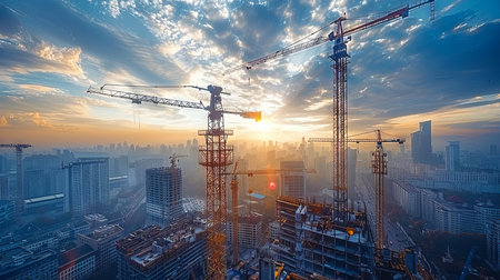An image captures a construction site at dawn, featuring cranes, partially built structures, and workers. The scene is bathed in warm sunlight, with a cityscape visible in the background. This photograph portrays a dynamic urban development environment, potentially suitable for illustrating infrastructure, progress, and building projects.
