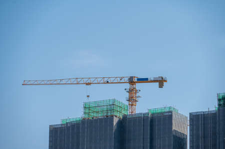 It's a fine day with blue sky, and the tower crane on the high-rise buildings in the city is under construction