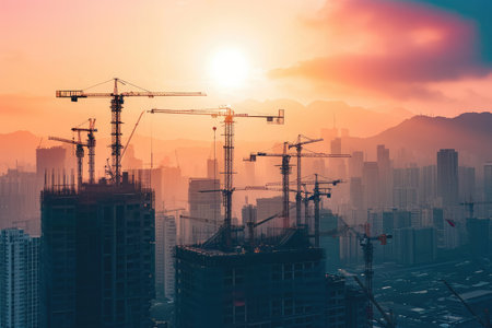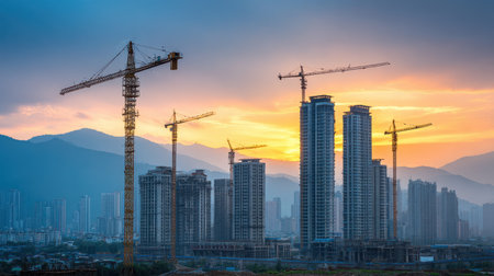 A captivating sunset illuminates a bustling construction site featuring towering cranes and a vibrant city skyline, showcasing urban development and growth.