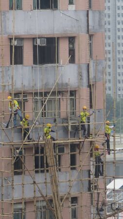 Hong Kong, East Asia - November 26, 2019: Intricate bamboo scaffolding being erected by chinese workers in Kowloon business district