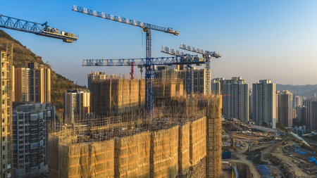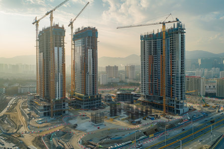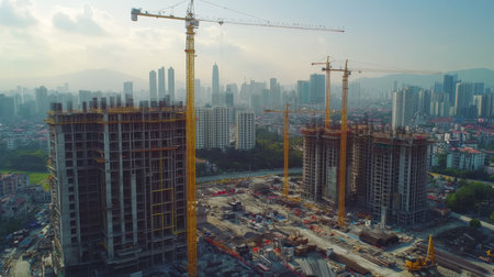 A dynamic view of several tall buildings in various stages of construction, featuring cranes, scaffolding, and a bustling city environment. Signifying progress and urban expansion.