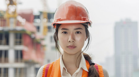 A smiling Chinese female construction worker standing in construction site. Generative AI AIG19.
