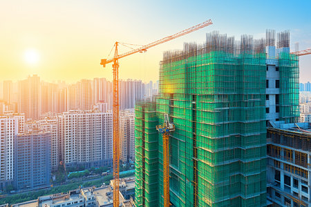 A striking image depicting the construction of a high-rise building, complete with scaffolding and a crane, set against a vibrant urban skyline.