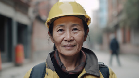 A smiling senior Chinese female construction worker standing in construction site. Generative AI AIG19.