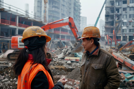 man and woman workers talking on a construction site, an excavator illuminated by the evening sun is walking behind them