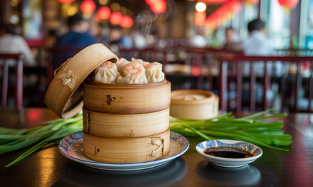 Dim Sum Assortment Unwind: Steaming Bamboo Basket of Assorted Dim Sum in Traditional Chinese Restaurant, Lively Atmosphere