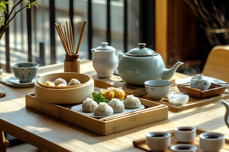 A beautifully arranged plate of dim sum reveals delicate steam buns paired with a traditional Chinese teapot, showcasing the rich culinary heritage in an elegant dining atmosphere.