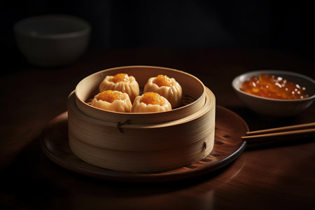 Generative AI Image of Fresh Chinese Cuisine Authentic Food Dim Sum Dumpling on Bamboo Steamer