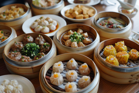 Dim Sum gathering, featuring a variety of small, intricately arranged dishes on a rustic wooden table, including steamed buns with golden brown tops, delicate dumplings wrapped in translucent wrappers.