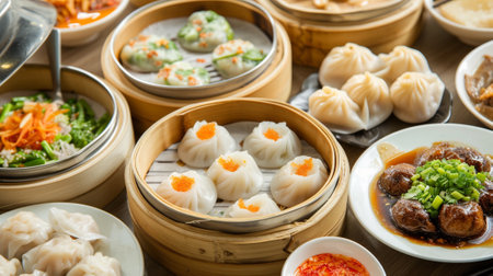 Indulge in authentic Chinese dim sum presented in bamboo steamers, showcasing a variety of delicious dumplings and elegant presentation.