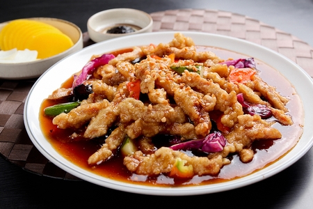 chinese cuisine. Stir-fried pork in sweet and sour sauce