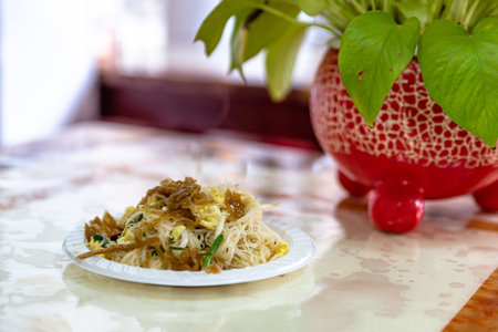 Asian traditional food. Fried rice noodles with chicken meat, vegetable slices sprinkled with sesame seeds.