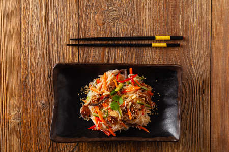 Oriental salad with rice noodles, chicken and mint. Top view.