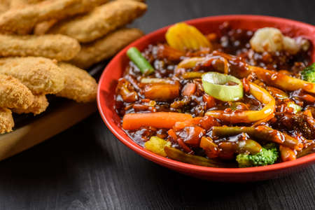 sweet and sour chicken on a wooden table with copy space