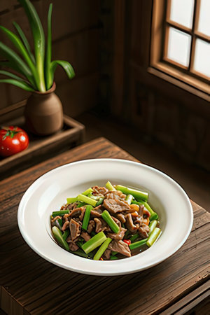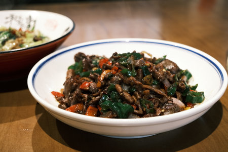 A plate of delicious and spicy Hunan dishes, fried pork with chili