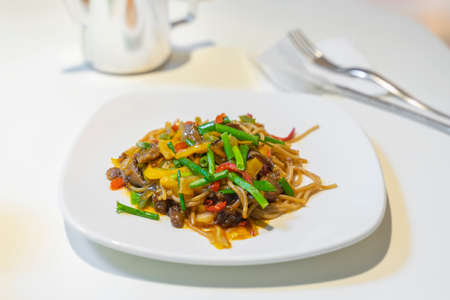 Asian noodles with different vegetables and meat in a white plate on the table close-up,, traditional asian food