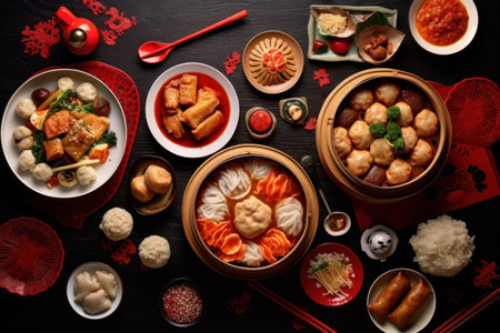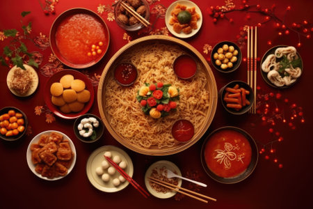 Festive red table setting with a variety of Chinese dishes, capturing the spirit of the Lunar New Year, perfect for a restaurant menu or cultural celebration.