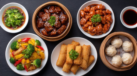This vibrant arrangement showcases an enticing variety of Asian dishes, highlighting a blend of flavors and textures that celebrate culinary creativity.