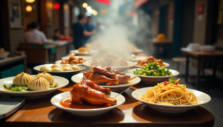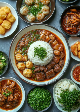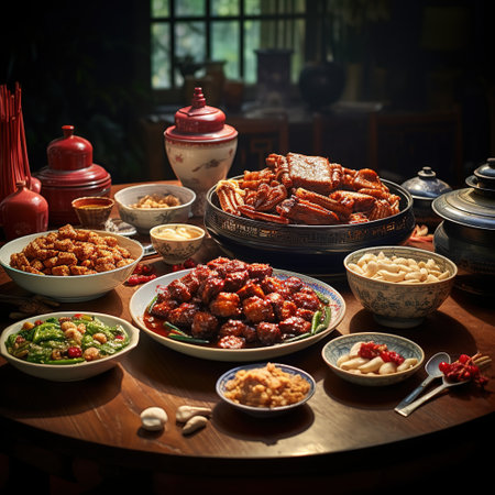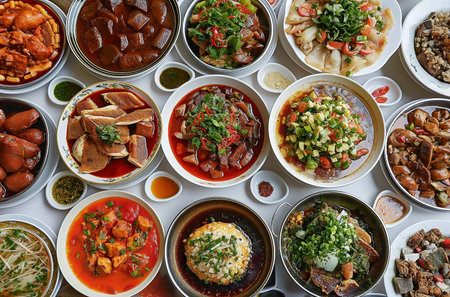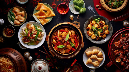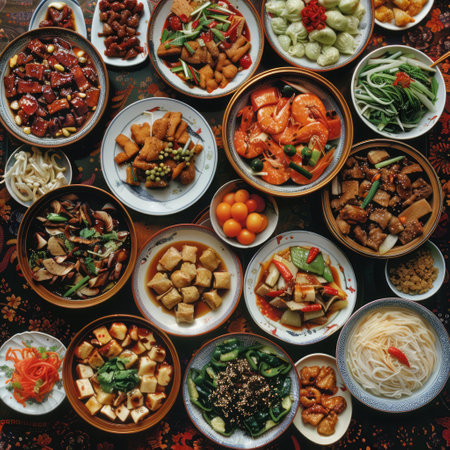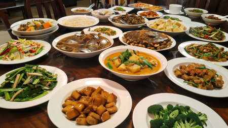 An inviting array of Asian dishes presents a colorful feast on a dining table, showcasing various flavors and ingredients that celebrate culinary culture.