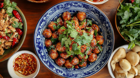 Enjoy a vibrant bowl of delicious Asian meatballs garnished with cilantro, surrounded by an array of fresh ingredients. Perfect for culinary inspirations!