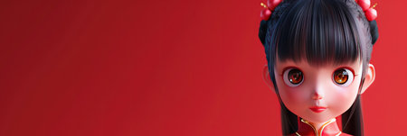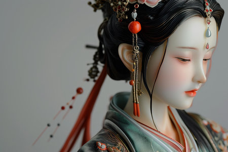 Close-up portrait of an elegant doll in traditional Korean hanbok, copy space.