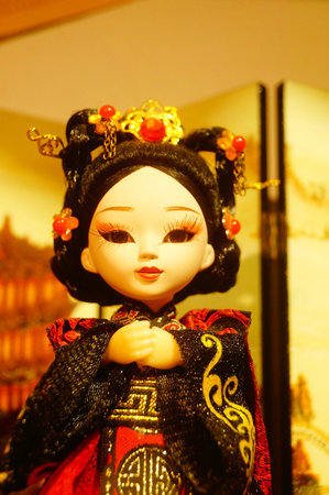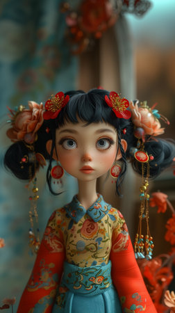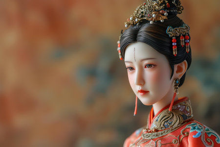 Exquisite doll in traditional asian bridal attire posing with detailed craftsmanship and vibrant colors