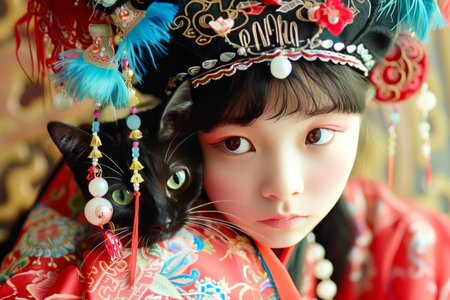 Young girl in colorful traditional attire cuddles a black cat, showcasing cultural fashion and pet bonding